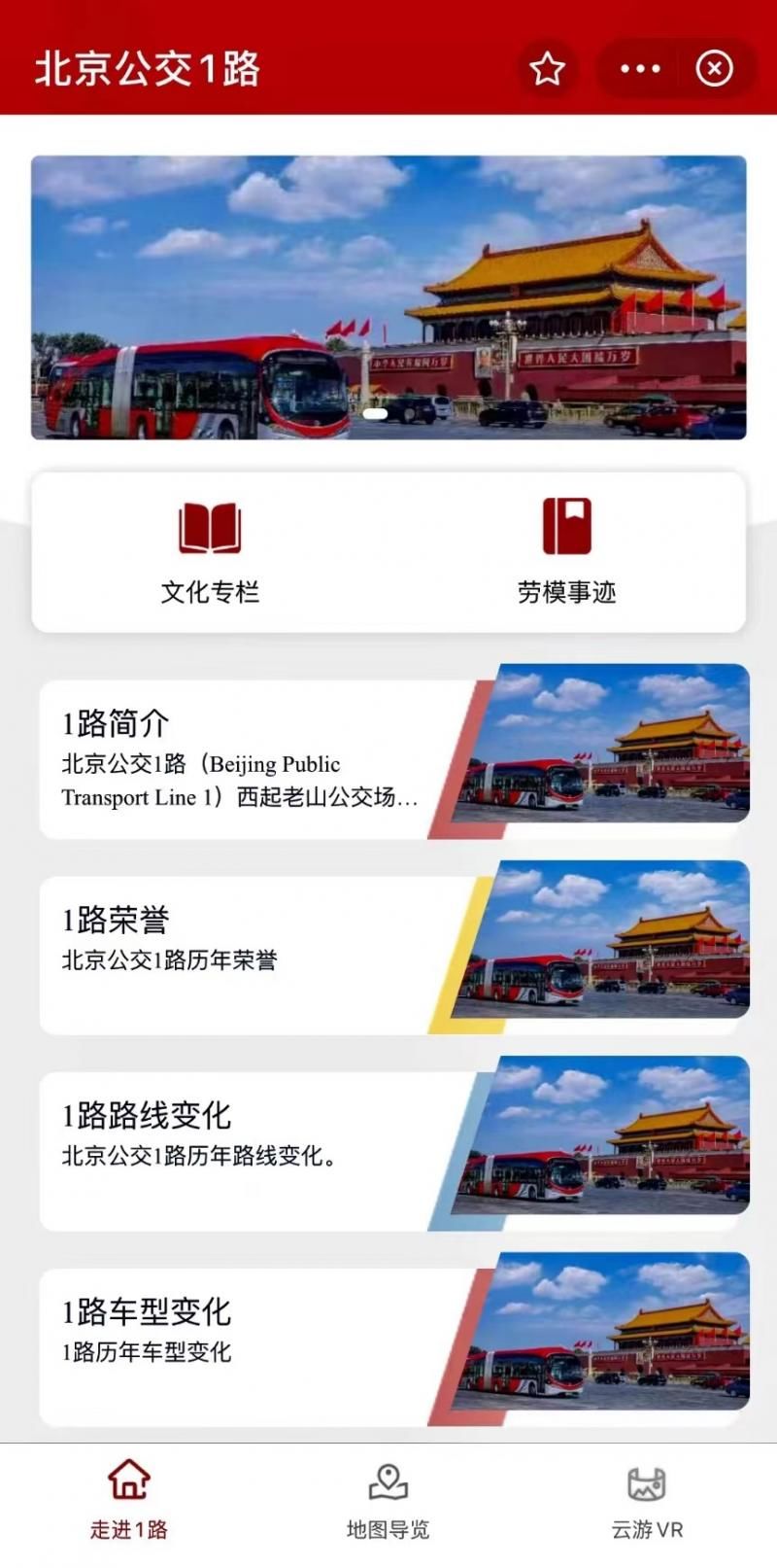 北京公交1路是北京历史最悠久的公交线路,起于老山公交场站,穿越东西长安街,途经天安门、南礼士路、军事博物馆等标志性站点,止于四惠枢纽站。此次,北京移动与北京公交携手打造的“云游1路”小程序,将创造虚拟现实结合、线上线下一体的全新“大1路”乘车体验之先河。